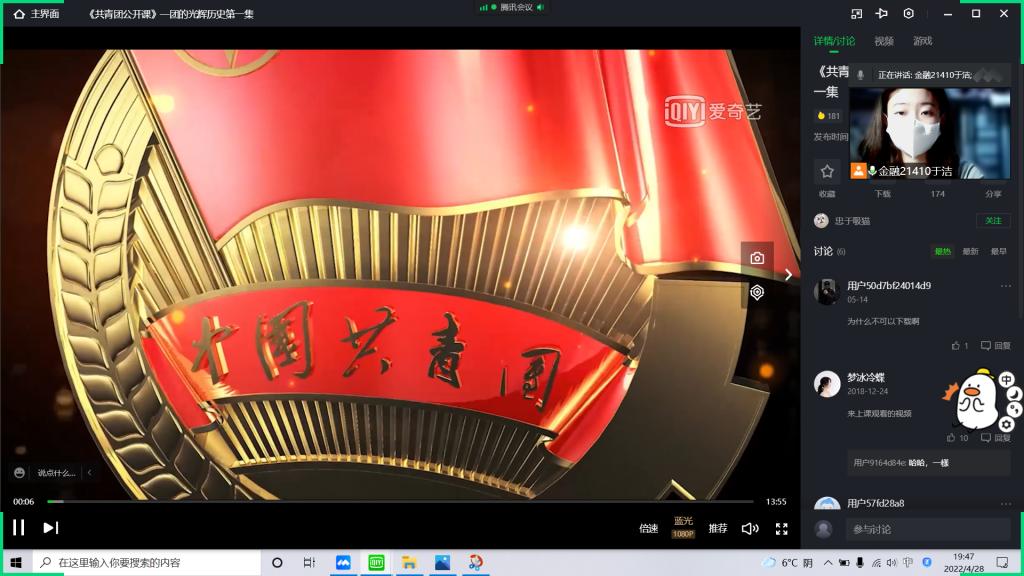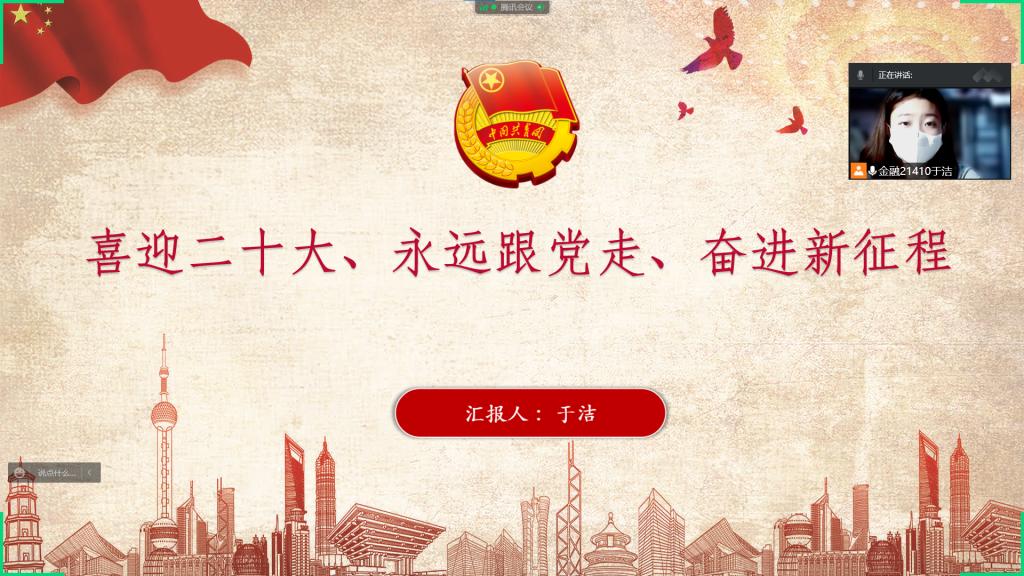本次活动分为两部分。一是“喜迎二十大、永远跟党走、奋进新征程”——庆祝中国共青团成立100周年。二是集中学习观看《团的光辉历史》团课。活动伊始,由主持人向大家介绍本次活动主题、意义,以及党的二十大的召开时间、地点。随后,同学们打开摄像头、麦克风等对此次活动展开讨论。紧接着,主持人带领大家观看《团的光辉历史》团课,讲解了共青团走过的100年发展历程。部分同学分享了一些自己收集的关于共青团的小故事。本次主题团日活动的开展既让同学们对共青团有了更深的认识,也让同学们对党的二十大的召开有了更多的了解。