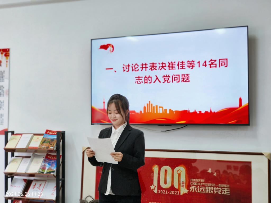 最后程琳进行总结讲话。她对崔佳等14名同志被发展为中共预备党员表示衷心地祝贺,并希望同志们永远铭记这个神圣的时刻,以此为契机,树立正确的世界观、人生观和价值观,进一步加强理论学习,努力工作,充分践行全心全意为人民服务的宗旨,发挥模范带头作用。