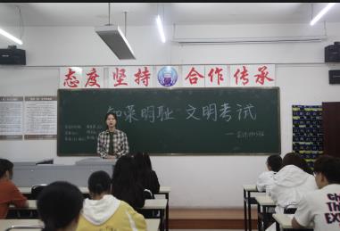 会议期间,王微老师列举了近年来发生的高考作弊的行为,利用鲜活的事例让同学们切身体会高考作弊的危害及严重性。同时,王微老师说到:“作弊不一定进入考场,场外参与也是作弊的行为。”要求同学们敲响警钟,杜绝参与高考作弊,做一名遵纪守法的大学生。