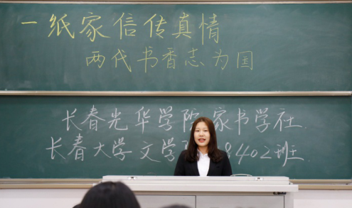 随后,在一教阶梯5教室,我校家书学社社长陈露露向长春大学同学们介绍了我校6年来开展一封家书活动的情况、经验和体会,以及成立家书学社的目的和方向,归结起来就是组织同学们“提笔写家书,把爱写出来”。