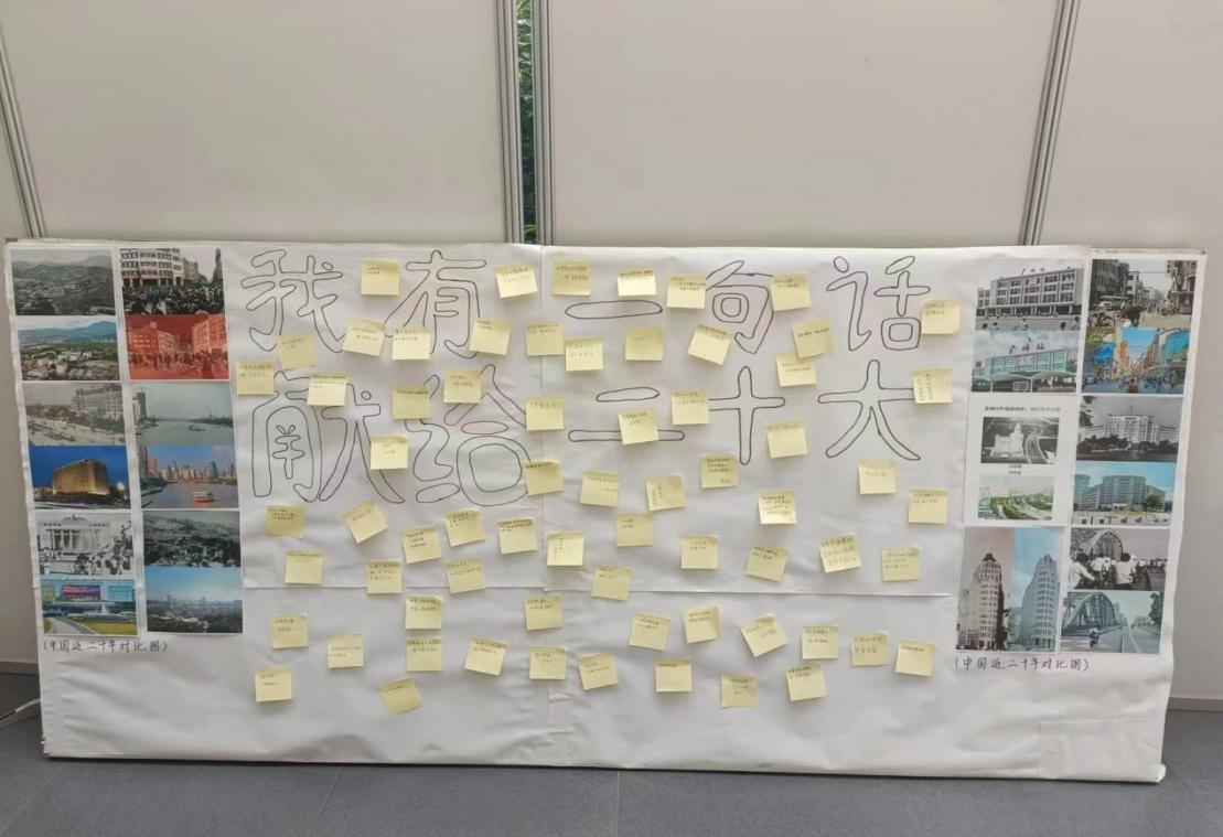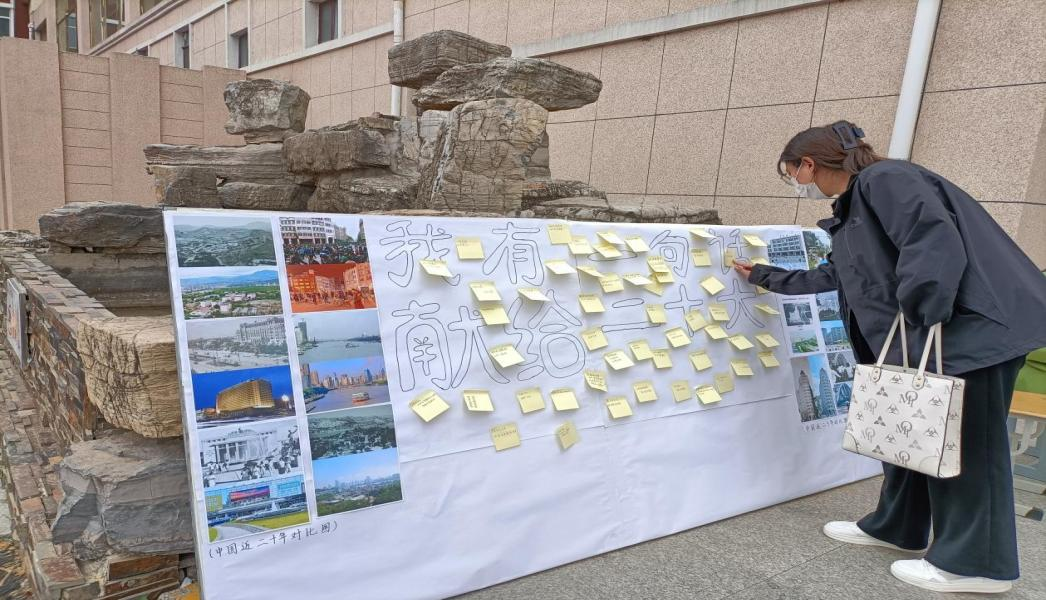 活动过程中,工作人员向来往的同学介绍这些年来祖国的快速发展。同学们和老师们纷纷驻足,并在展板前认真观看。工作人员向同学们分发便利贴,同学们踊跃地在纸上写下对祖国未来发展的展望和祝福。一张张便利贴被大家亲手粘在展板上,一张张便签纸写下的是对祖国繁荣发展的期望,更是对实现中华民族伟大复兴的信心。