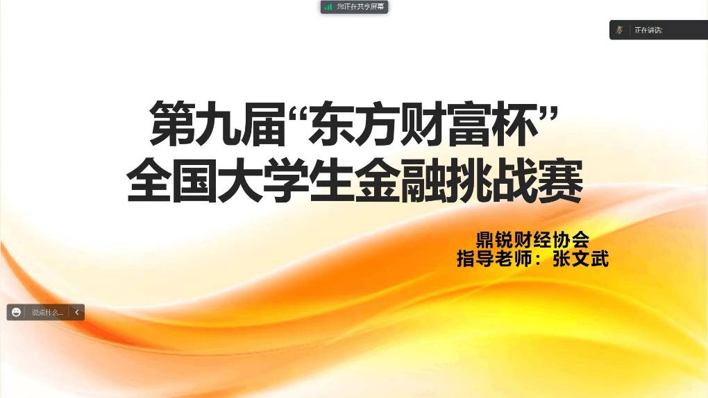 博观而约取,厚积而薄发。为进一步让同学们了解“东方财富杯”金融挑战赛的赛事信息,加强学生对金融理财知识的理解,培养同学们对金融理财的兴趣与热情,鼎锐财经协会于2023年5月12日下午13:00召开线上赛前培训会议。本次会议由张文武老师主讲,全体参赛同学参加。
