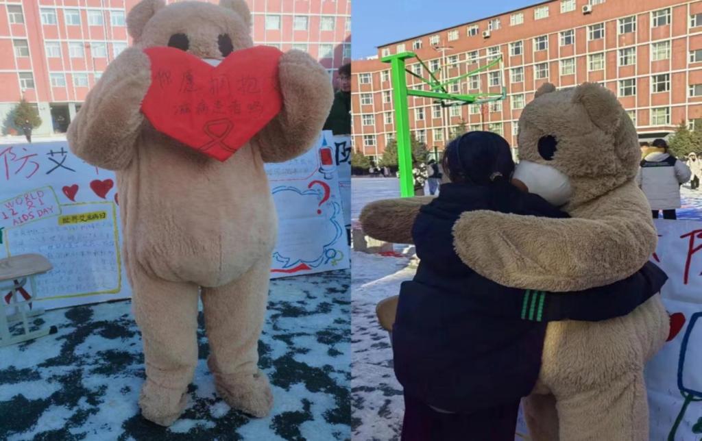 最后,在“艾”的抱抱——拥抱“防艾小熊”的环节中,工作人员穿上玩偶服扮演艾滋病患者,鼓励同学们主动拥抱“艾滋病患者”,旨在呼吁同学们能在未来生活和学习中对艾滋病患者群体少一些偏见与恐惧,多一些关爱和善意。