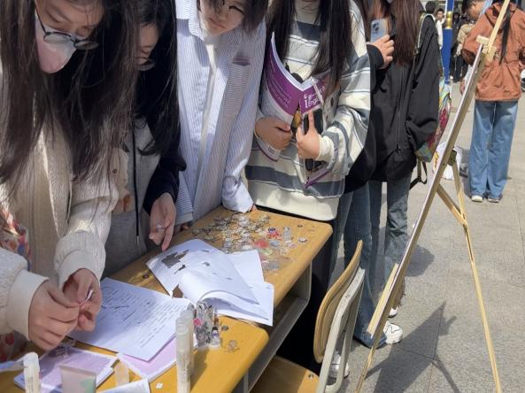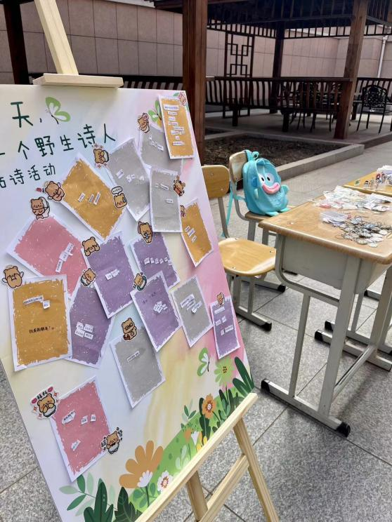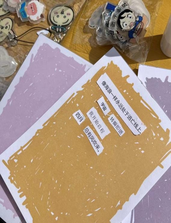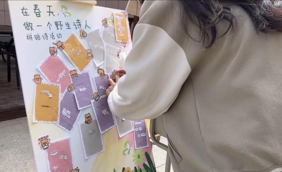 活动前期,志愿者布置好现场,为同学们提供多首现成诗歌,以供同学们选择自己感兴趣的诗以拼贴形式进行填词创作,同时还提供丰富的素材,供同学们根据自己的想象力自行拟定诗歌风格和主题,在纸上编织春日之诗,放飞思绪,充分展现自己的文采。