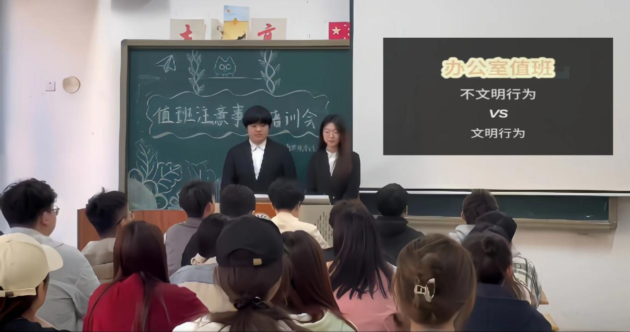 随后,主持人借助一段对比鲜明的视频,生动展示了办公场所值班时应有的文明礼仪与不当行为的鲜明对比,使同学们对于在值班时应保持的良好行为有了更深刻的理解。视频中,不文明的行为如大声交谈、频繁使用手机等被捕捉下来,主持人指出了这些行为如何会对教师的工作造成干扰,以及如何破坏办公室的和谐氛围。同时,视频也展示了文明值班的行为如何能够创造出一种宁静而宜人的工作环境。最后主持人对同学们提出的在办公室值班时容易出现的问题进行了耐心解答,并表示将认真考虑同学们的建议,进一步完善值班工作流程。