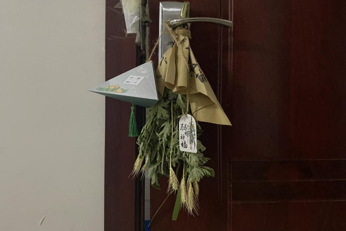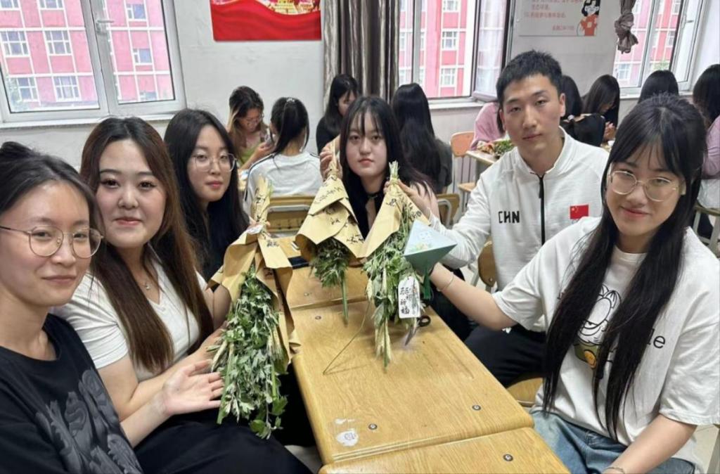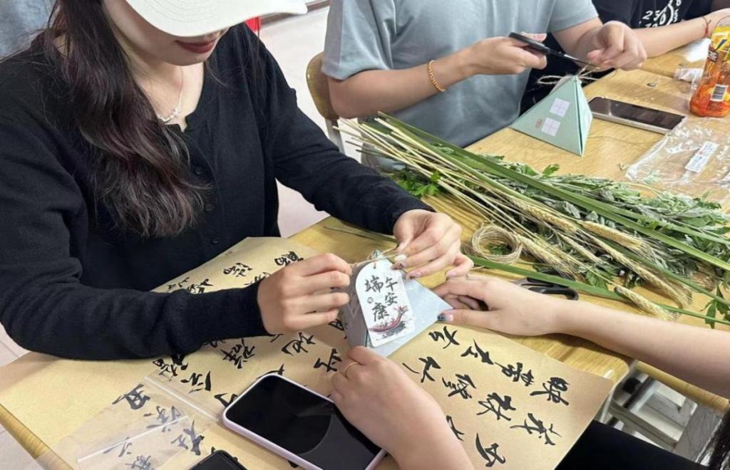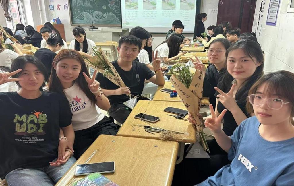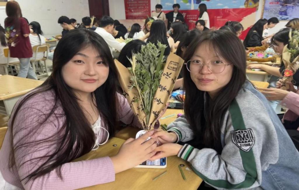 首先,主持人向大家介绍了悬挂艾草的寓意及制作艾草花束的步骤,在工作人员的指导下,同学们积极发挥动手能力,将菖蒲打底,依次放上艾草、麦穗,接着用麻绳绑好并挂上端午祝福小卡片,一束束散发着清香、寓意美好的艾草花束便呈现在了同学们的眼前。艾草与花艺设计的结合,体现了传统与创新的融合,既保留了艾草的祈愿纳福的寓意,又赋予了其更丰富的文化内涵,更加激发了同学们对弘扬中华优秀传统文化的热情。