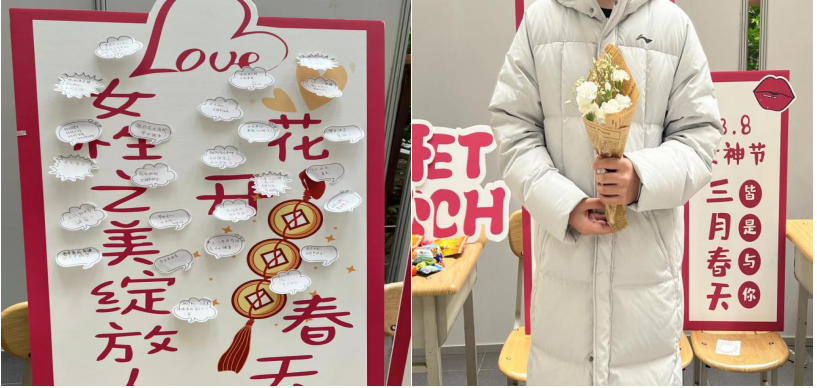 活动前期,志愿者们在现场准备了许多不同颜色的花束以及零食糖果,代表着不同的寓意,这让来到现场的每位女性都能成为活动现场的焦点,并准备了一个与主题相关的板报,供到场的同学们粘贴便签、合影留念。