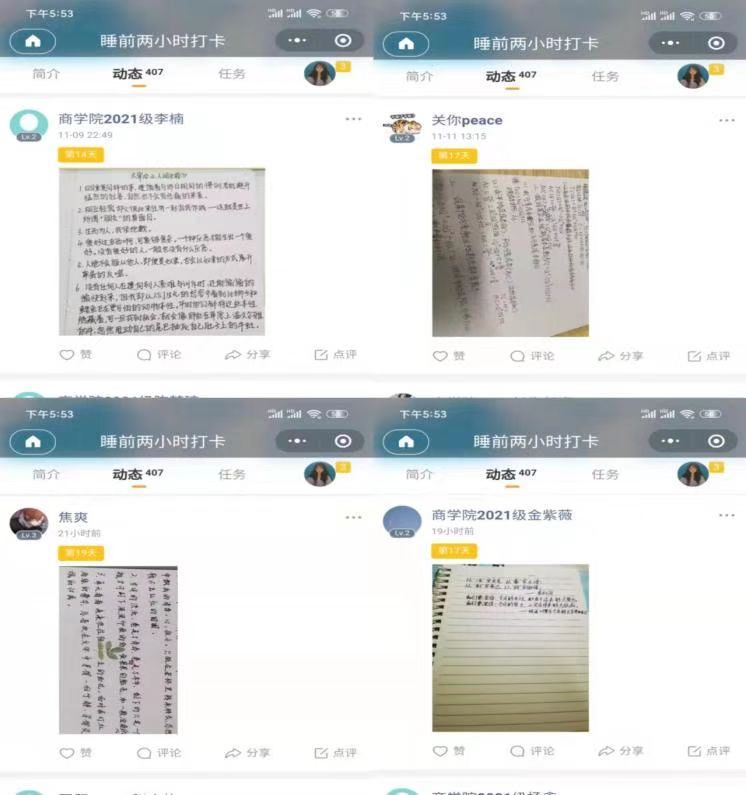 为激发同学们的阅读兴趣,养成良好的阅读习惯,小组成员在寝室开展21天睡前学习日记阅读打卡。同学们利用睡前两小时进行阅读笔记并对当天学习内容进行整理,追求内容“高质量”、字迹“高颜值”。每一本阅读手账,每一次打卡记录体现着同学们对学习的认真、对生活的热爱、对未来的憧憬。