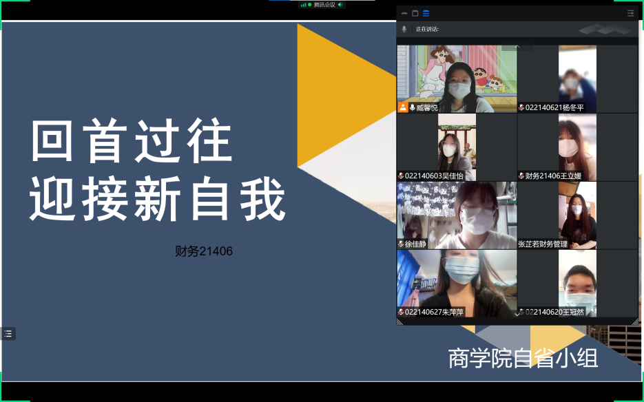 活动第二项,2022年6月19日,自省小组通过腾讯会议的形式开展“回首过往,迎接新自我”主题活动。鼓励同学们通过回顾2022第二学期的过往,在课余时进行反思,并在纸上写下感悟。活动中,主持人臧馨悦随机挑选几位同学分享感悟。同时让其他同学继续反思自身的问题并完善自我感悟。在掌声与主持人的感谢声中,同学们结束了精彩的发言。