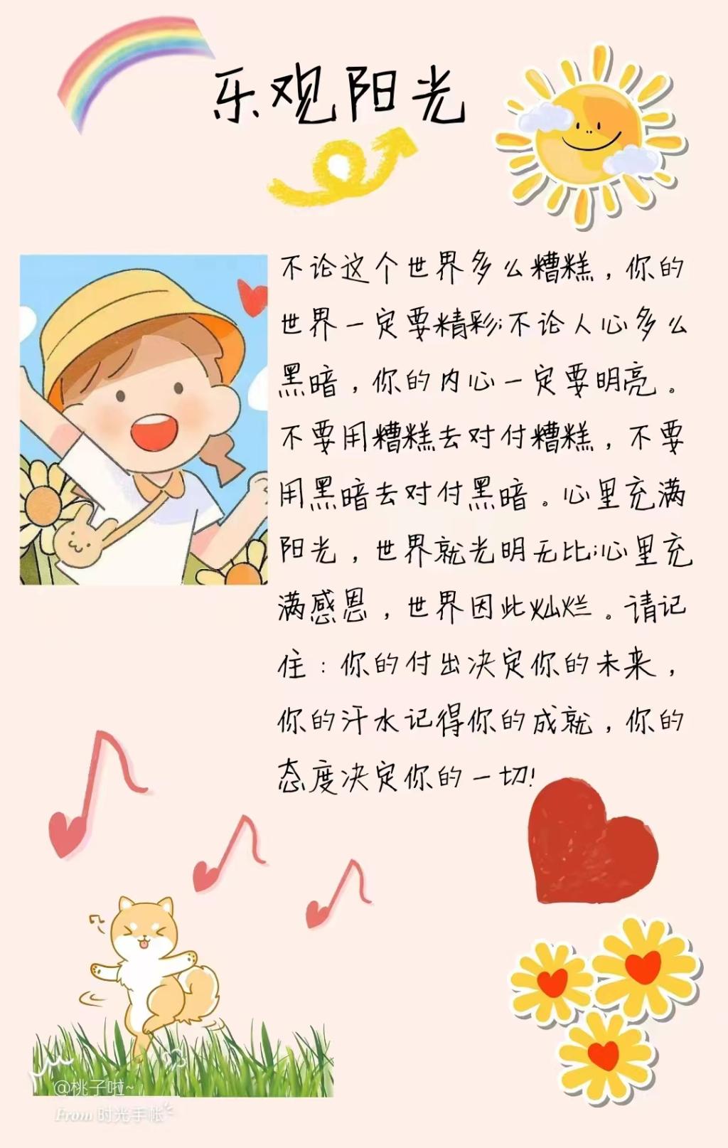 来自乐观阳光小组的同学和我们分享着他们的感悟:“不论这个世界多糟糕,你心里充满阳光,世界就光明无比;心里充满感恩,世界因此灿烂。用乐观阳光的心态去面对生活中的每一天,谁拥有了乐观,谁就拥有了希望;谁拥有了乐观,谁就拥有了艰难中敢于拼搏的精神!”