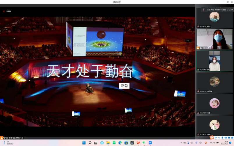 活动伊始,李霞菲同学首先对本次活动的内容进行了简单的介绍,并宣布了宣讲会的内容:本次活动共有十一位演讲同学,他们将会给所有参会人员分享他们身边“最勤奋的人的故事”或者“名人勤奋事迹”。随后,盖楠同学最先从大家熟知的谷爱凌开始进行讲述,介绍了谷爱凌是如何从一个她自称“对滑雪并没有天赋的人”,通过自己的不懈努力、勤奋学习逐渐努力成奥运会冠军的故事。紧接着,其他宣讲人为参会人员介绍的袁隆平院士、鲁迅先生、邓稼先、霍金等伟人的故事内容更加丰富,让同学们感触颇深。通过这十一位同学的宣讲故事,同学们深刻认识到,每个人的成功都不是偶然,而他们在人们看不到的地方付出了成倍的努力。本次活动每位演讲的同学都提前做足了准备,富有个人特色的PPT、感情充沛的演讲、自己的内心感悟,无一不让每位聆听的同学都有了自己独一无二的见解和感触。