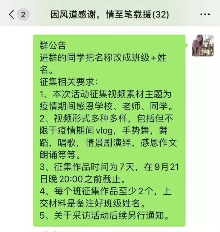 活动伊始,负责人在微信群中发布本次活动的内容及要求。本次视频征集活动以感恩学校、老师、同学为主题,同学们以班级为单位参加,通过抖音快手等视频软件,根据自己的特长,做出内容精彩形式新颖的创意作品,以此来表达同学们的感恩之情。