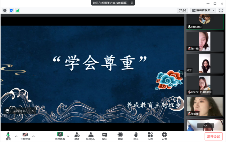 孟子曾说过:爱人者,人恒爱之;敬人者,人恒敬之。尊重是自古以来就存在的好习惯。为帮助同学们学会尊重、理解尊重,养成尊重他人的习惯,更好地发扬中国的优良传统。yl6809永利养成教育尊重小组于2022年9月20日15:00在线上举行了“敬人者,人恒敬之”养成教育尊重主题活动。本次会议由尊重小组负责人孙旭阳主持,小组全体成员参加。