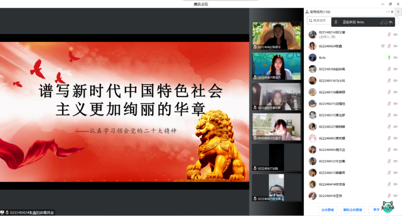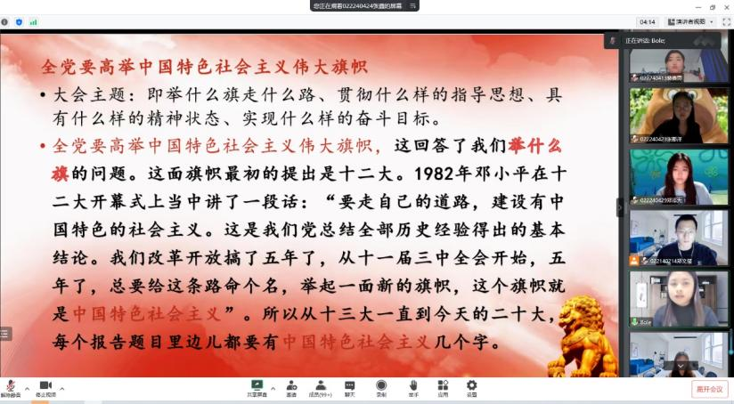 为全面深入学习宣传贯彻党的二十大精神,推动广大师生迅速把思想和行动统一到党的二十大精神上来,yl6809永利官网集团养成教育读书小组邀请双辽市党委组织部李媛媛开展中国共产党第二十次全国代表大会宣讲报告,于2022年11月25日以线上的形式开展,由yl6809永利党总支副书记秦成伟出席会议,郑文玺主持,全体22级同学参加报告会。