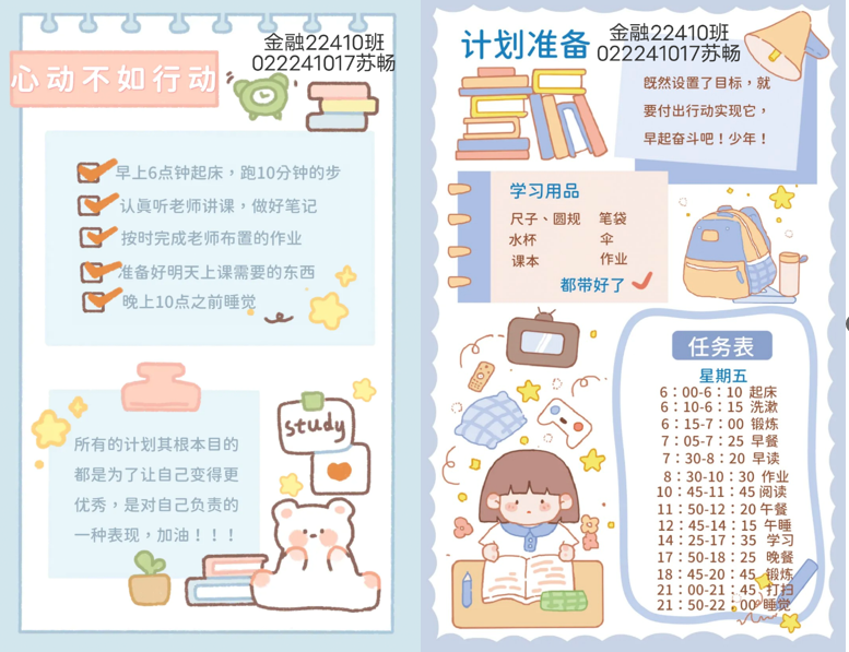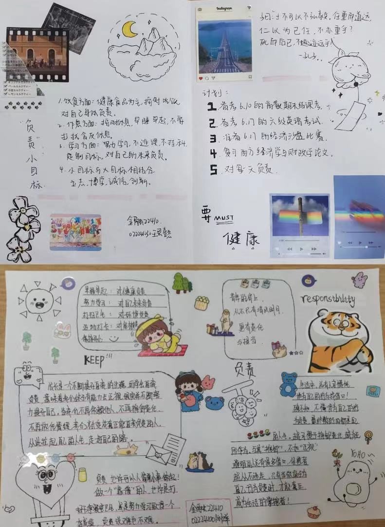 活动伊始,活动负责人简明扼要地介绍此次活动的开展流程,向小组成员传达要求,每位成员需在6月21日到28日的期限内建立自己要完成的几个短期目标,并制作手账,由负责人汇总并建立电子手账册留作保存。在活动过程中,同学们积极配合,热情参与活动,对活动内容的具体要求进行仔细询问,提出优化建议,认真制作,最终共同促进活动圆满完成。此次活动通过简单的几个短期目标的建立与解决,在同学们思考对自己,对家庭,对学校,对社会的责任关系过程中,清楚社会的发展与进步离不开“责任”二字,生活的美好与幸福同样离不开“责任”二字。“负责”,不仅是利人行为,同样也是利己行为,只有胸怀责任感,我们才能具有不竭动力勇往直前,才能感到许许多多有意义的事需要自己去做,才能真正得到人们的信赖和尊重,实现自我存在的价值和意义。