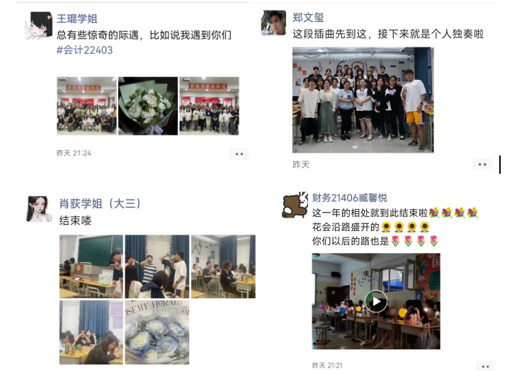 聚散会有时,再见亦有期。在晚自习结束时,各班班代为同学们送上了真挚的祝福,表示这一年见证了大家的成长,希望大家在未来的生活中更加努力充实自己,敢拼敢闯做自己想做的事,走好人生的每一步,未来可期。这番话令大家深刻感受到了学长学姐的期待与祝愿,让同学们感慨万千。最后,各个班级的班代学长学姐们以及辅导员王微老师与同学们进行合影留念。