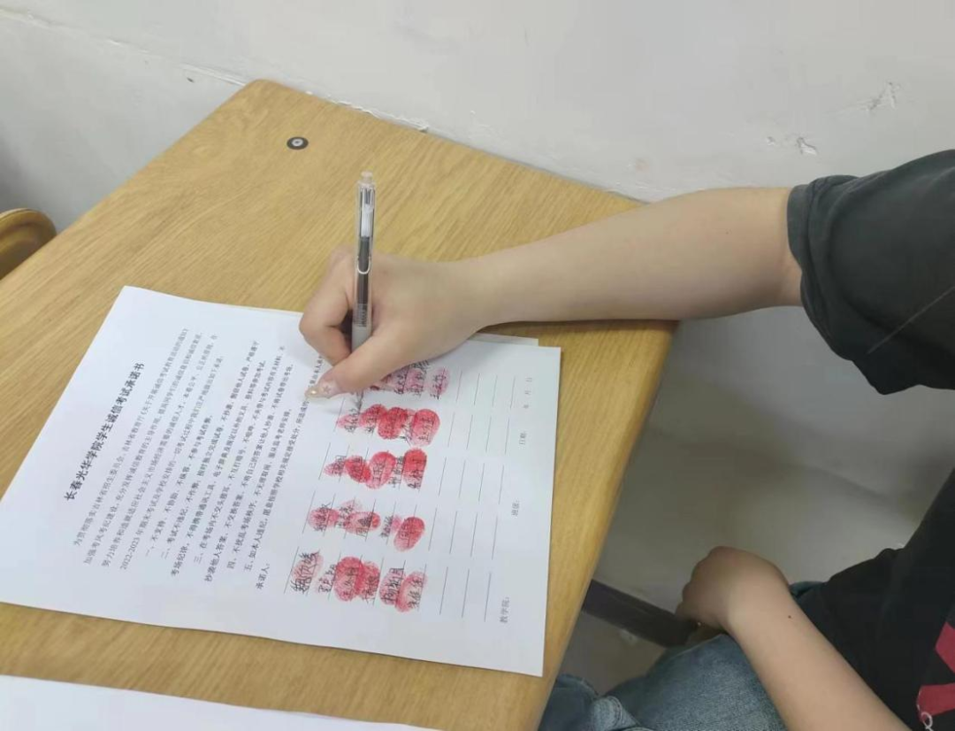 为了强化同学们的自律意识,普及学校考试要求,在主题班会结束后,各班学习委员组织同学们在《诚信应考承诺书》上签下自己的名字并摁上手印。督促各班级同学端正考试态度,提高对考试作弊严重性的认识,营造公平的考试环境。