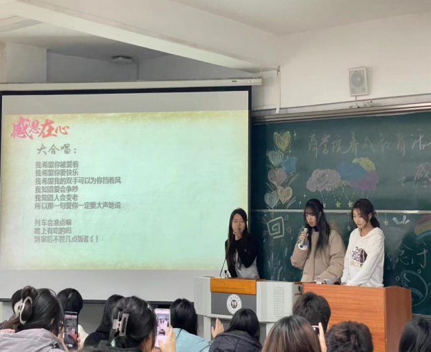 首先,张珍玉先对出席的嘉宾和参加本次活动的同学表示热烈的欢迎,并以一个感恩故事为切入点向大家说明了什么是感恩以及如何感恩。紧接着,播放同学们与父母之间的合照视频,向大家展现出同学们与父母、朋友一起度过的快乐时光,让同学们懂得感恩是要去珍惜身边的亲人,也让同学们意识到需要腾出更多的时间陪在父母和朋友身边。