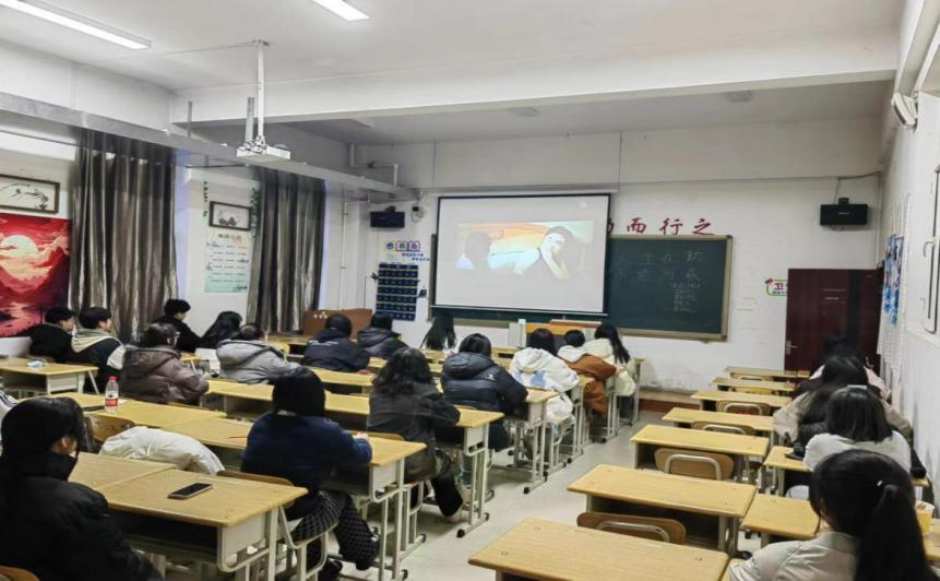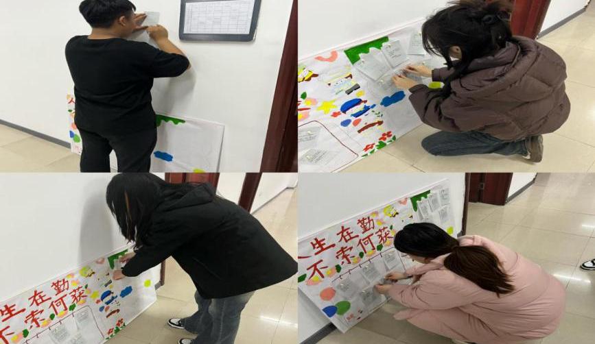 首先,主持人将活动宣传海报放置于教室门口,同时向同学们介绍活动主要内容。随后,主持人播放热门电影《热辣滚烫》,无论是演员的减肥经历还是影片中的热血情节都让同学们意识到勤奋的重要性,同时引发同学们对自身不足的思考。影片结束后主持人组织同学们结合思考题写下勤奋宣言,并在勤奋宣言墙背景板上写上自己的目标,希望通过写下目标的方式督促同学们勤奋做事,积极进步,不忘初心,砥砺前行。最后,同学们将自己的感悟钉在了教室外的勤奋宣言板上,将对于勤奋的感悟不吝分享,所有同学都可以任选喜欢的宣言领取,营造勤奋向上的活跃氛围。