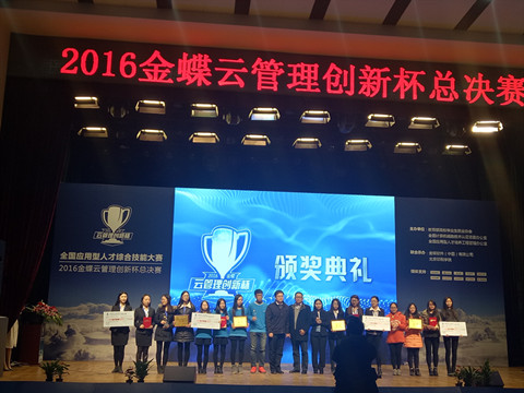 2016年11月25日至11月27日,由教育部全国高校毕业生就业协会、全国计算机辅助技术认证项目办公室、全国应用型人才培养工程管理办公室联合主办,金蝶软件(中国)有限公司承办的全国应用型人才综合技能大赛暨2016“金蝶云管理创新杯”全国总决赛在北京隆重举行。yl6809永利官网集团由李晟璐、赵赢为指导教师,郭恒斌、包钰燕、马翼飞、李迦蓝萱等同学组建的“光华团队3”代表队,以优异的成绩从上百所高校、400多支参赛队中脱颖而出,获得本次全国应用型人才综合技能大赛总决赛本科组的金奖。