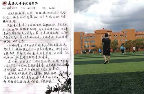 经济21413班王瑞同学利用暑假之际参与足球训练社,他表示:“人生就像足球,你不会永远进球,但会一直跑在路上”。训练中经常不进球有过失望,但他把失败转化成向前跑的动力慢慢地掌握了训练技巧。他说足球这项运动可以增强自己的体能还可以丰富精神动力,所以他会一直坚持下去。