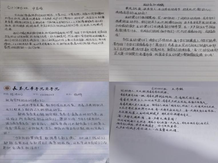 活动前期,由负责人通过微信公众号平台、线下通知等方式进行宣传,同学们以班级为单位进行报名,踊跃地参与本次活动。在班级经过初次筛选后,将符合要求的加油稿进行整合,上交到对接人员处。经老师及工作人员复审后,达到参赛要求的加油稿即可给予奖励。本次活动收到了来自同学们各具特色、各有风采的投稿,商院学子用文字书写和记录对运动的热爱以及对青春的赞美。本着“公平、公正、公开”的原则,现评选出三个最优班级。