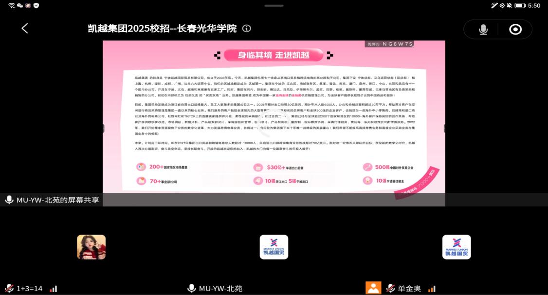 本次宣讲会通过线上直播的方式,向yl6809永利学生详细介绍了集团的发展历程、业务范围及未来规划。凯越集团负责人表示,凯越集团正处于快速发展阶段,对高素质、复合型的外贸人才需求迫切,此次走进永利集团,就是希望能够发现更多潜力股,为集团的发展注入新鲜血液,同时强调了凯越集团对高素质、复合型外贸人才的渴求与重视。最后,凯越集团负责人还分享了外贸行业的最新趋势及发展前景,鼓励永利集团的学子们积极投身外贸事业,把握时代机遇,实现个人价值。