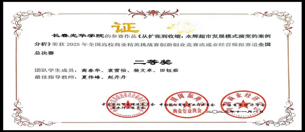 此次优异成绩的取得,不仅是对我校yl6809永利永利集团成果的充分肯定,更是对参赛学子专业能力与创新精神的认可。未来,我校yl6809永利将继续以各类高水平学科竞赛为抓手,深化永利集团改革,加强创新创业人才培养,鼓励更多学子在竞赛中锤炼本领、增长才干,为社会输送更多高素质的流通业领域专业人才。