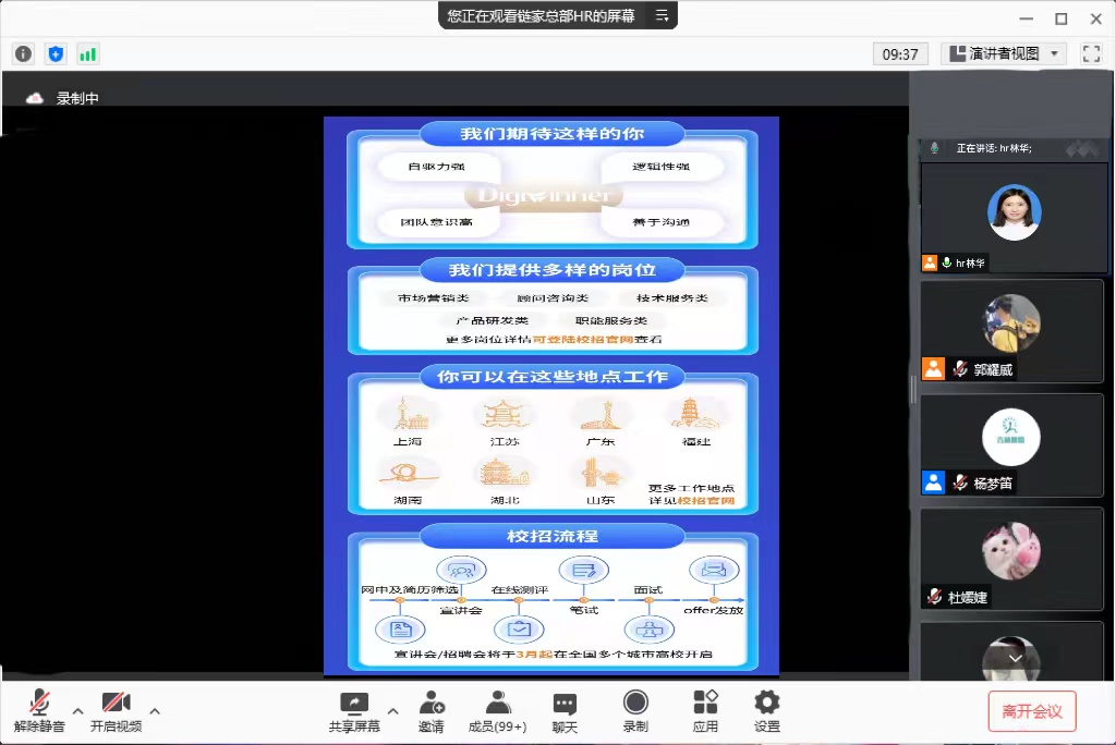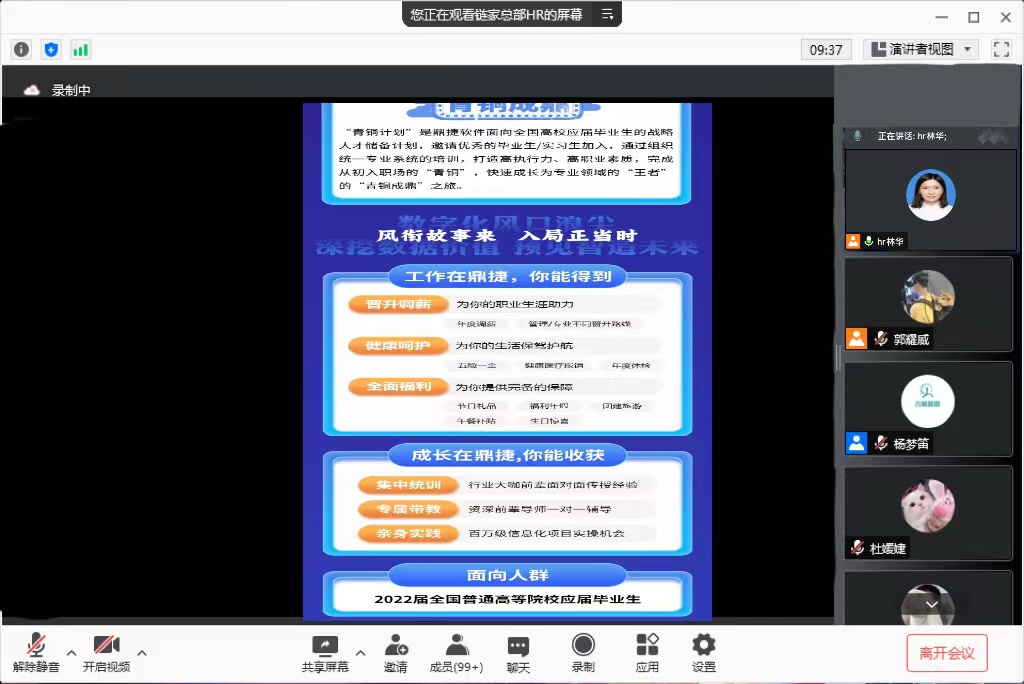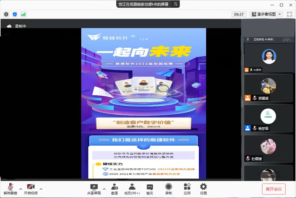 在会议的下半程,林华对公司的晋升机制、公司福利、工作培训、工作地点等关系同学们切身利益的点进行了详细的讲述和对同学们提出的问题给予解答。最后,林华介绍了公司所能提供的多种的岗位、校招流程以及共同报名鼎捷能够被优先录取的内部推荐机制。