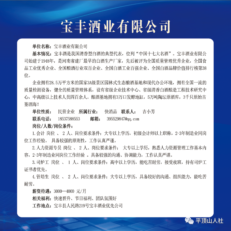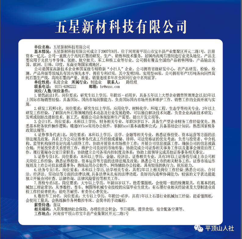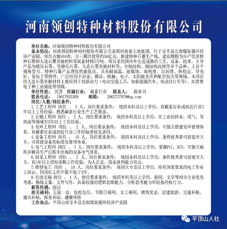 招聘:乳酸方向领军人物2名,烘培专家1名,要求硕士学历,相关专业,有相关工作经验,工程师47名,降解新材料技术员5名,化验员/质检员15名,要求本科学历,相关专业,自动化技术员20名,安全管理员2名,要求大专学历,相关专业,有注册安全工程师证。联系人:何涌涛 0394-8985369 邮箱:1623895353@qq.com 地址:河南省郸城县金丹大道08号