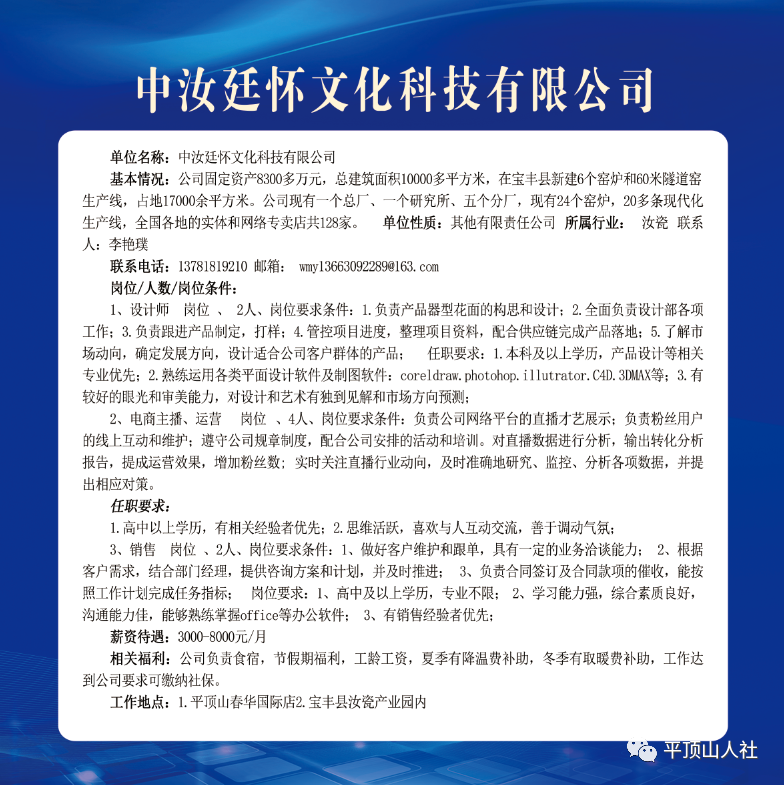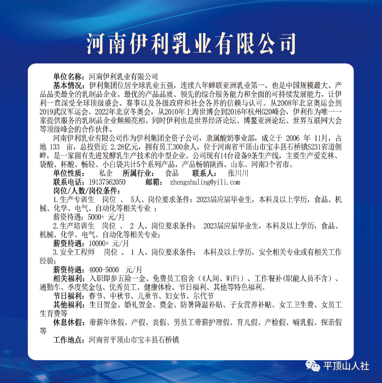 三门峡崤云视联科技有限公司招聘:公共关系2名,要求大专及以上学历,行业不限,具备政务行业销售、大客户销售或政府相关部门关系拓展等工作对接者优先考虑。办公地点:周口市,联系人:张亚南,电话18839890418周口港区投资发展有限公司招聘:疫情防控岗6人,要求公共卫生、医学类专业,本科学历,性别不限,年龄22—35岁。联系人:陈莉,电话15993280005