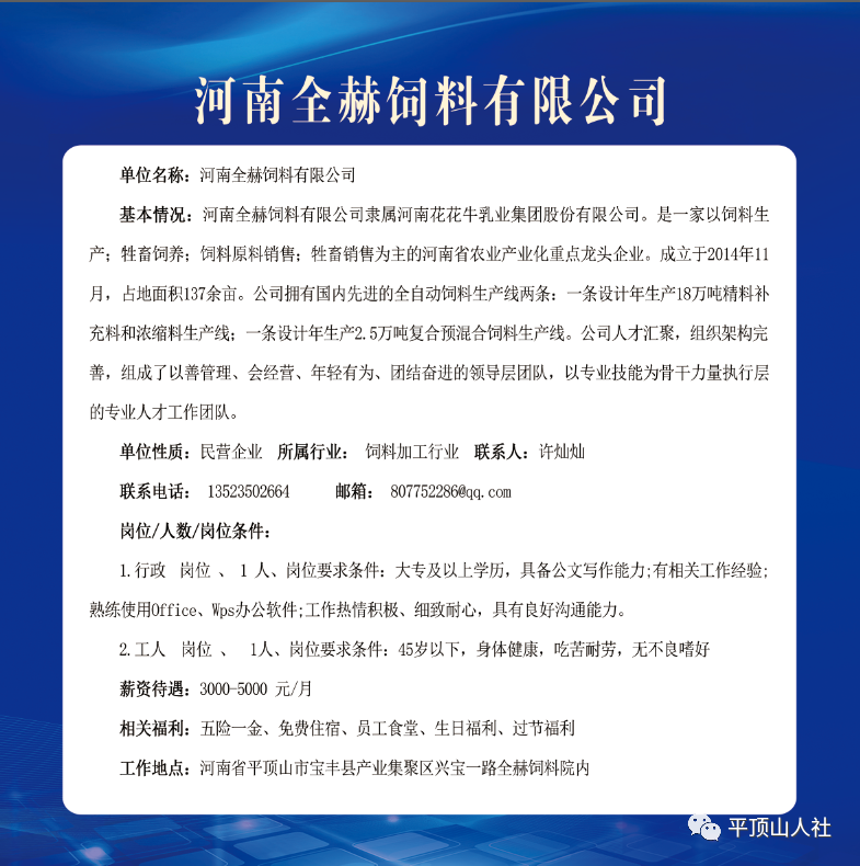 招聘:销售代表20名,工艺工程师2名,质量工程师2名,市场专员2名,原料销售(饲料方向)5名,要求本科学历,相关专业,技术支持3名,研发工程师5名,要求硕士研究生学历,相关专业。联系人:李泳珊0394-8378080邮箱:hr@heagreen.com 地址:河南省周口市经济开发区开来路