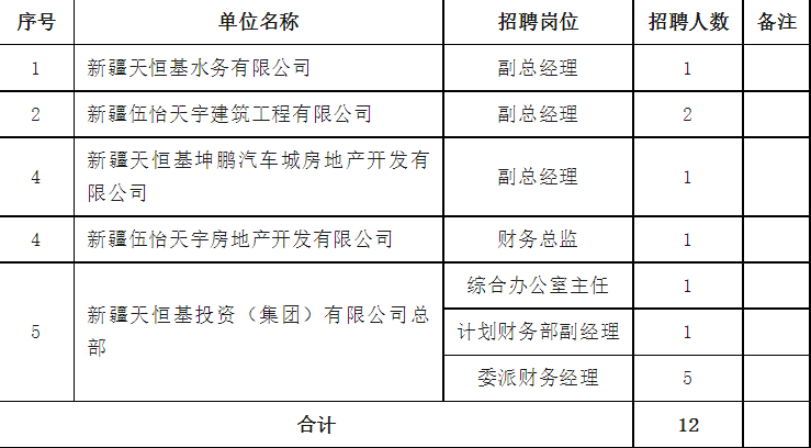 (一)选聘岗位:新疆天恒基水务有限公司副总经理、新疆伍怡天宇房地产开发有限公司副总经理、新疆天恒基坤鹏汽车城房地产开发有限公司副总经理、新疆伍怡天宇建筑工程有限公司财务总监,集团总部综合办公室主任岗位、集团计划财务部副经理岗位、委派财务经理岗位(详见下表)。