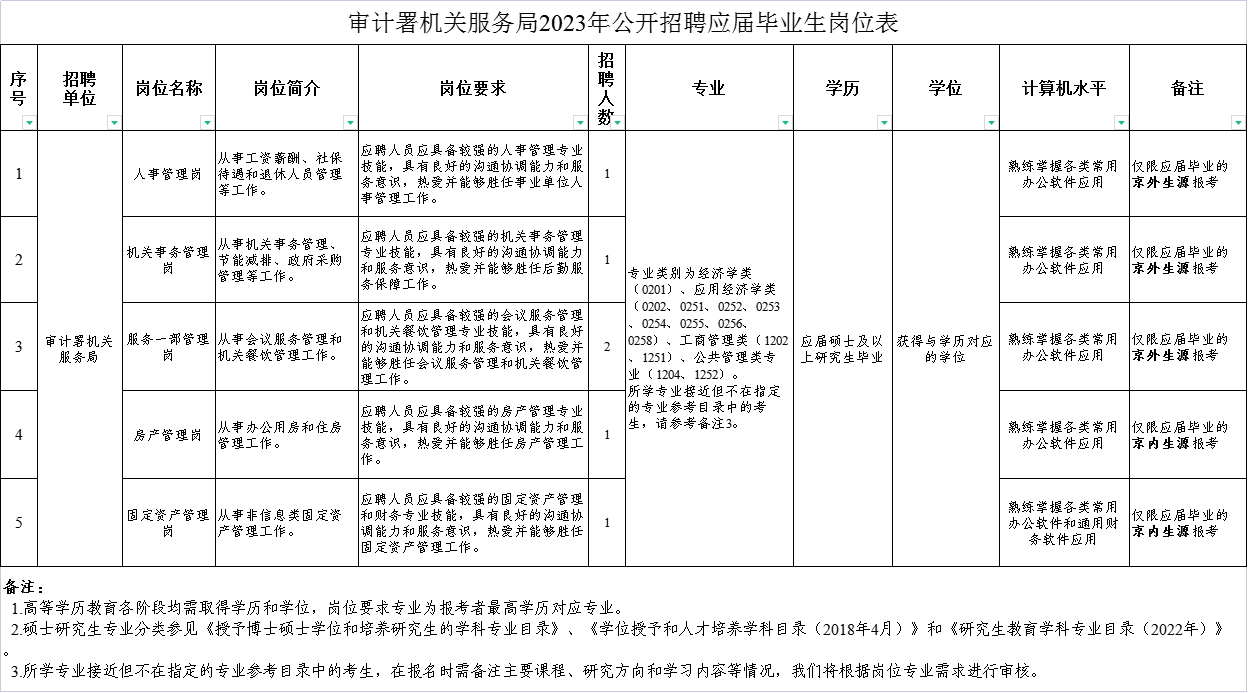 根据工作需要,审计署机关服务局现公开招聘应届毕业生(不含定向生、委培生)。现将有关事项公告如下: