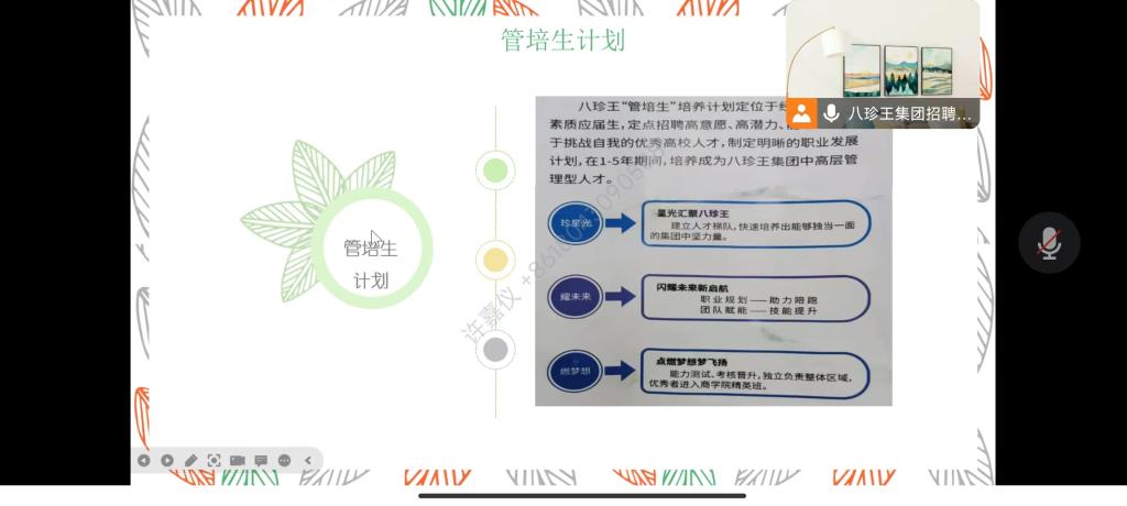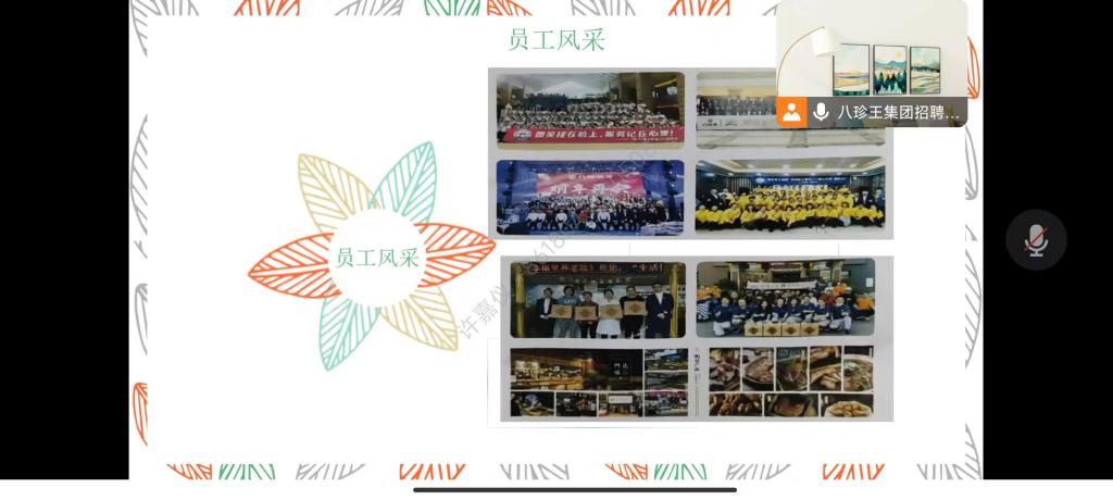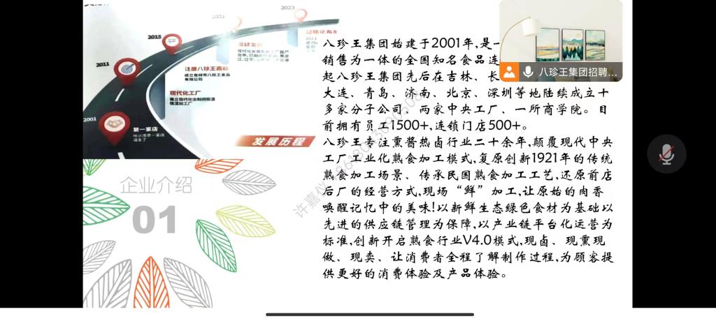 会议伊始,招聘人员以PPT的形式就八珍王集团的企业介绍、福利待遇、工作环境、管培生项目以及招聘流程与岗位等几个方面向同学们做了简单介绍。他提到,八珍王集团始建于2001年,是一家集研发生产、销售为一体的全国知名食品连锁集团。未来他们的企业将融合更多国内外先进的行业资源与产业链资源,聚焦主业、赋能产业资源,为推动吉林省经济的发展,振兴行业做出新的突破与贡献。随后,招聘人员在现场解答了同学们的疑问,并建立了微信群方便后续的交流与联系。