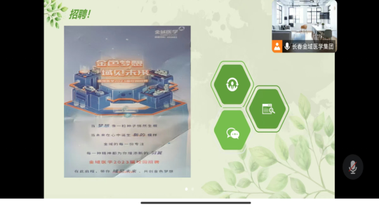 会议伊始,金域医学集团招聘人员就公司介绍、岗位职能、招聘流程以及企业与个人的学习与成长等介绍了有关于金域医学集团的相关内容。他提到,金域医学集团是我国第三方医学检验行业的开创者和领导者。企业长期提供有竞争力的薪酬福利、领先行业的创新型人才培养体系、全国多个子公司轮岗机会与积极向上的团队氛围,还有1V1导师辅导、海内外重点机构院校学习机会以及与时俱进的主题文化活动和轻松愉悦的工作环境。福利待遇丰厚,企业资源充足,期待更多的人才能够加入企业,共同建设企业。金域医学集团招聘人员讲道:当梦想像一粒种子悄然生根,当未来在心中诞生新的模样,金域医学2023届校园招聘,在此启程,带你“域见未来、共创金色梦想”。随后,招聘人员回答了在场同学的许多疑问,并表示公司将提供良好的福利待遇、工作环境。建立了招聘咨询群,方便后续学生答疑与询问。