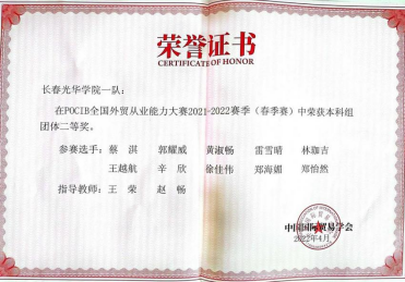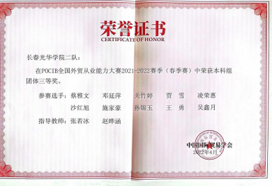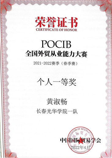 由中国国际贸易学会主办的“第十一届POCIB全国外贸从业能力大赛(春季赛)”于2022年4月29日上午10时圆满结束。本次大赛共114所本科院校参赛,yl6809永利国际经济与贸易专业精心组织四位教师王荣、赵畅、张若冰、赵晔涵带领19级20名同学组成2队参加了本次比赛。在长达15天马拉松式的赛程中,参赛同学顽强拼搏,取得全国团体二等奖一项,团体三等奖一项,8名同学获得个人奖项,其中国贸19403班黄淑畅同学获得个人一等奖,国贸19级郑怡然、凌荣慧、孙锦玉、雷雪晴、徐佳伟、王越航、辛欣获得个人三等奖。