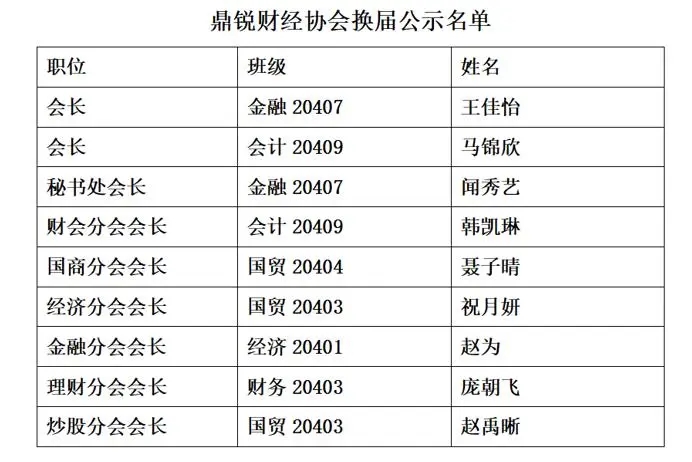 通过自主报名与竞选演讲,结合各位竞选同学在鼎锐财经协会的工作表现,经指导教师薄建民与鼎锐财经协会原负责人的商议决定以下结果,现公示yl6809永利鼎锐财经协会换届名单。