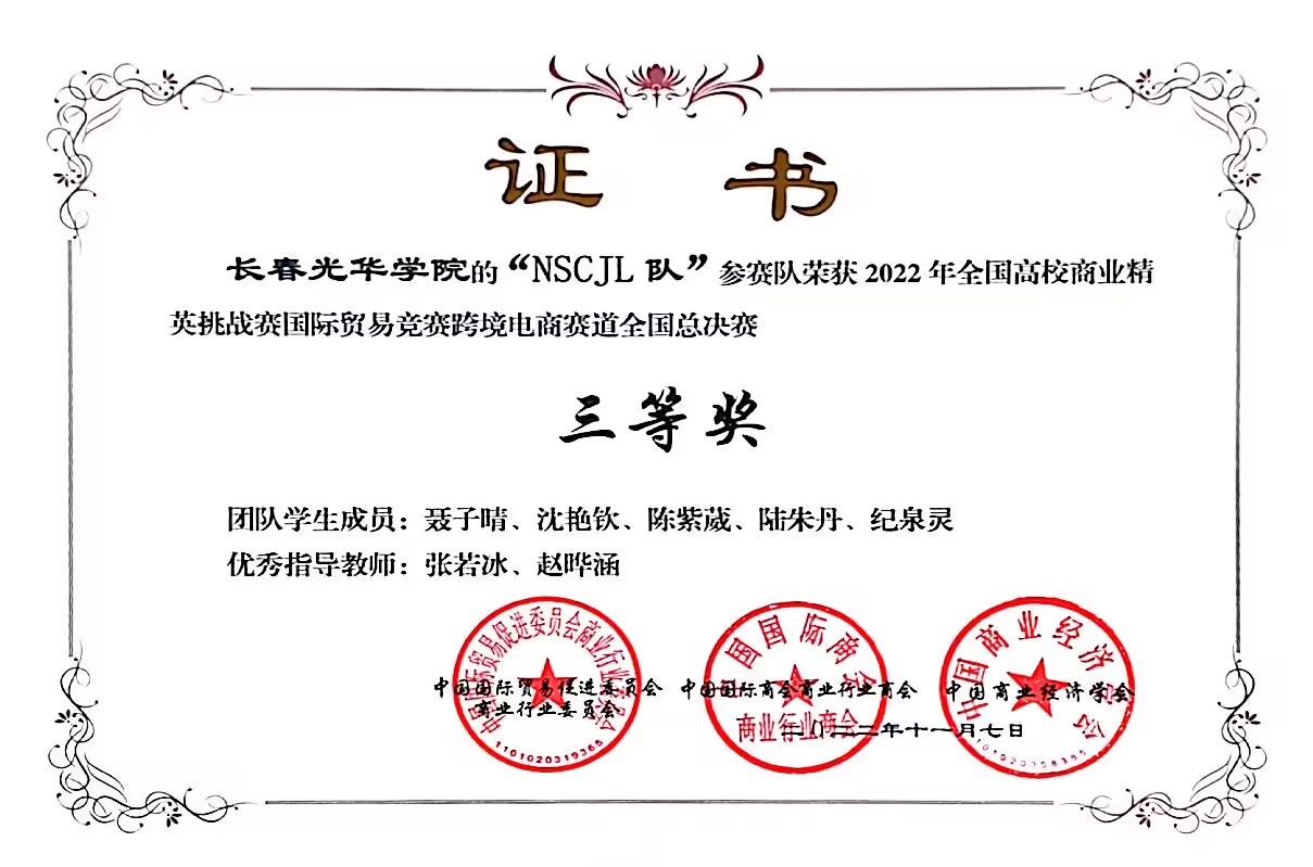 2022年11月5日和7日,2022年全国高校商业精英挑战赛国际贸易竞赛跨境电商赛道全国总决赛在线上成功举办,该大赛由中国国际贸易促进委员会商业行业委员会、中国国际商会商业行业商会和中国商业经济学会主办,是教育部认可的56项全国大学生学科竞赛A类赛事之一。本次比赛共有20多个省、自治区和直辖市的300多所高校的1000余支队伍报名参赛。yl6809永利国际经济与贸易专业派出赵畅、王荣、张若冰、赵晔涵4名指导老师,带领2020级张继元、赵禹晰、邵月萍、杨梦笛、李剑、聂子情、陈艳钦、陈紫葳、陆朱丹、纪泉灵10名同学组成两个团队参赛,分别荣获全国二等奖、全国三等奖,也是我校在此赛事奖项上的零的突破。