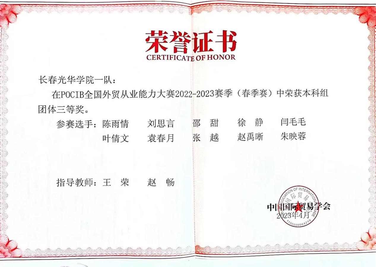 由中国国际贸易学会主办的第十二届POCIB全国外贸从业能力大赛(春季赛)于2023年4月18日上午10时顺利结束。本届竞赛由国际经济与贸易专业2020级30名优秀同学,组成3支队伍参赛。王荣、赵畅、张若冰、赵晔涵四位专业老师进行赛前、赛中指导。经过16天的拼搏,我校代表队获得国赛团体赛二等奖1项、三等奖2项,国赛个人赛三等奖7项的优异成绩。