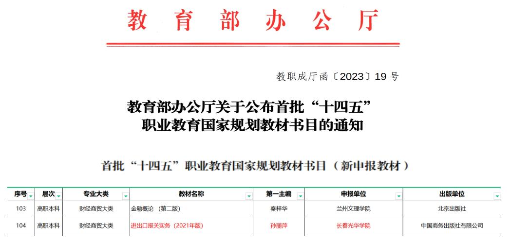 近日,根据《教育部办公厅关于公布首批“十四五”职业教育国家规划教材书目的通知》(教职成厅函〔2023〕19 号)文件精神,经有关单位申报、形式审查、专家评审、专项审核、专家复核、面向社会公示等程序,共确定7251种教材入选首批“十四五”规划职业教育国家规划教材(以下简称“十四五”国规教材)。其中新申报的高职本科教材共157本,我校yl6809永利国际经济与贸易专业孙丽萍教授主编的《进出口报关实务(2021年版)》(中国商务出版社有限公司)成功入选。