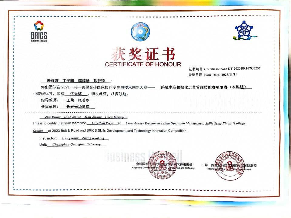 近日,2023年第七届一带一路暨金砖国家技能发展与技术创新大赛之首届跨境电商数据化运营管理技能赛圆满结束。永利集团王荣老师和张若冰老师带领国际经济与贸易专业学生参加了本次大赛,全国共800多支队伍通过初赛和复赛。该项赛事的初赛主要是跨境电商数据化运营管理基础理论考核,经过初赛,我院国际经济与贸易专业学生丁子晴、满梓旸、陈梦琦和朱雅婷组成的队伍冲入复赛。复赛主要内容是跨境电商海外直播推广,本组学生在复赛(本科组)中获得优秀奖。
