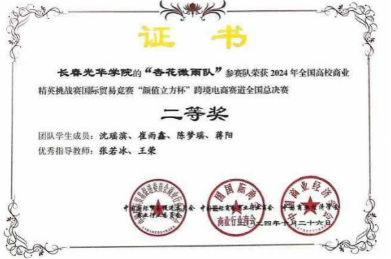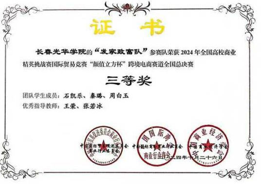 在张若冰和王荣老师的指导下,国际经济与贸易专业2022级学生沈瑶滨、陈梦瑶、崔雨鑫、蒋阳四位同学组成的“杏花微雨队”,从海量市场数据里洞察商机,到跨境平台运营时精准施策;从选品环节的独具慧眼,再到营销推广中的别出心裁,一路“披荆斩棘”,凭借扎实的专业知识与默契的团队协作,一举拿下全国总决赛二等奖。由学生石凯乐、秦璐、周白玉组成的“发家致富队”,面对复杂多变的跨境电商形势与强劲对手,始终坚守策略、灵活应变,最终成功斩获全国总决赛三等奖。