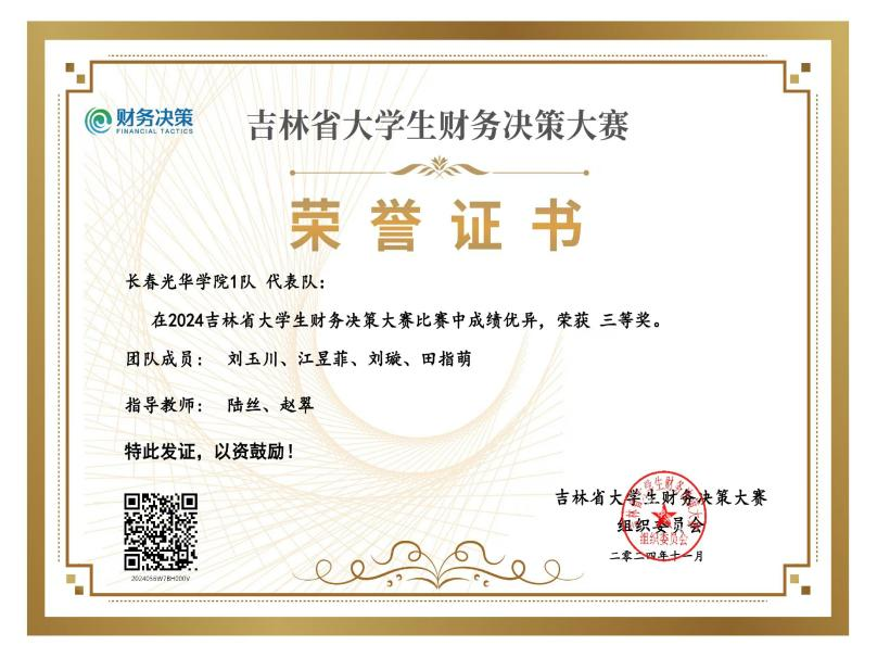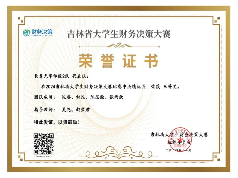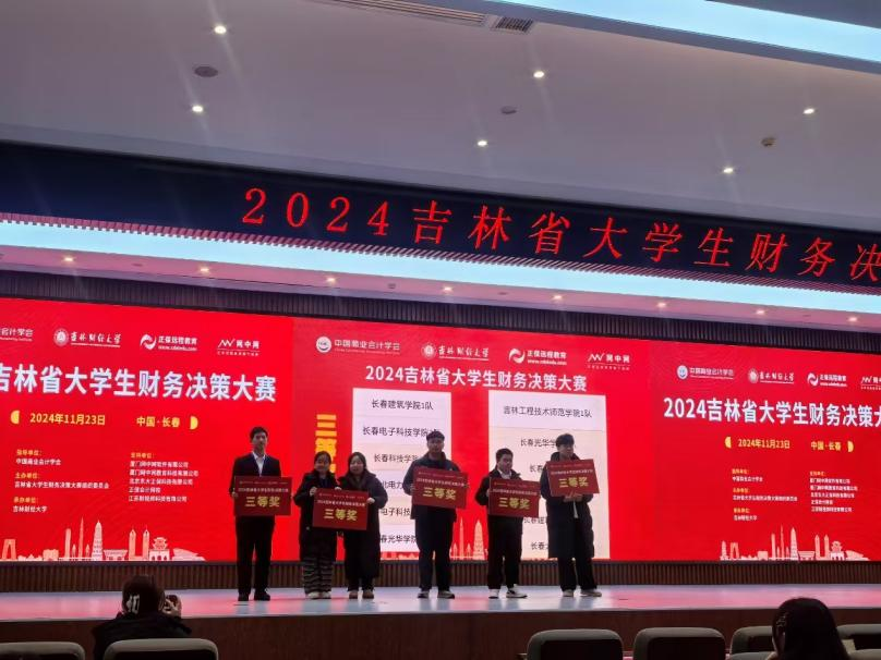 2024年11月23日,由中国商业会计学会指导,吉林省大学生财务决策大赛组织委员会主办,吉林财经大学承办,厦门网中网软件有限公司、厦门网中网教育科技有限公司、北京东大正保科技有限公司、正保会计网校、江苏财税科技有限公司支持的2024年吉林省大学生财务决策大赛落下帷幕。我校由陆丝老师和赵翠老师带领会计专业4名学生,刘玉川,江昱菲,刘璇,田指萌组成第1代表队;吴尧老师和赵翌君老师带领财务管理专业4名学生,沈琪,韩悦,陈思淼,张雨欣组成第2代表队,2支代表队参加此次比赛。经过一天的激烈角逐,最终2支代表队均在2024年吉林省大学生财务决策大赛省赛中荣获三等奖。