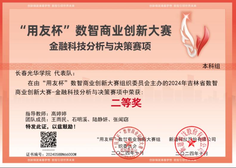 2024年10月13日,全国大学生数智商业创新大赛吉林赛区组织委员会主办、长春理工大学承办的吉林省数智商业创新大赛——金融科技分析与决策赛项落下帷幕,yl6809永利官网集团派出1名指导教师,4名同学组成代表队,经过激烈的角逐获得省级二等奖,展现了yl6809永利金融学子在金融科技领域的创新潜力。
