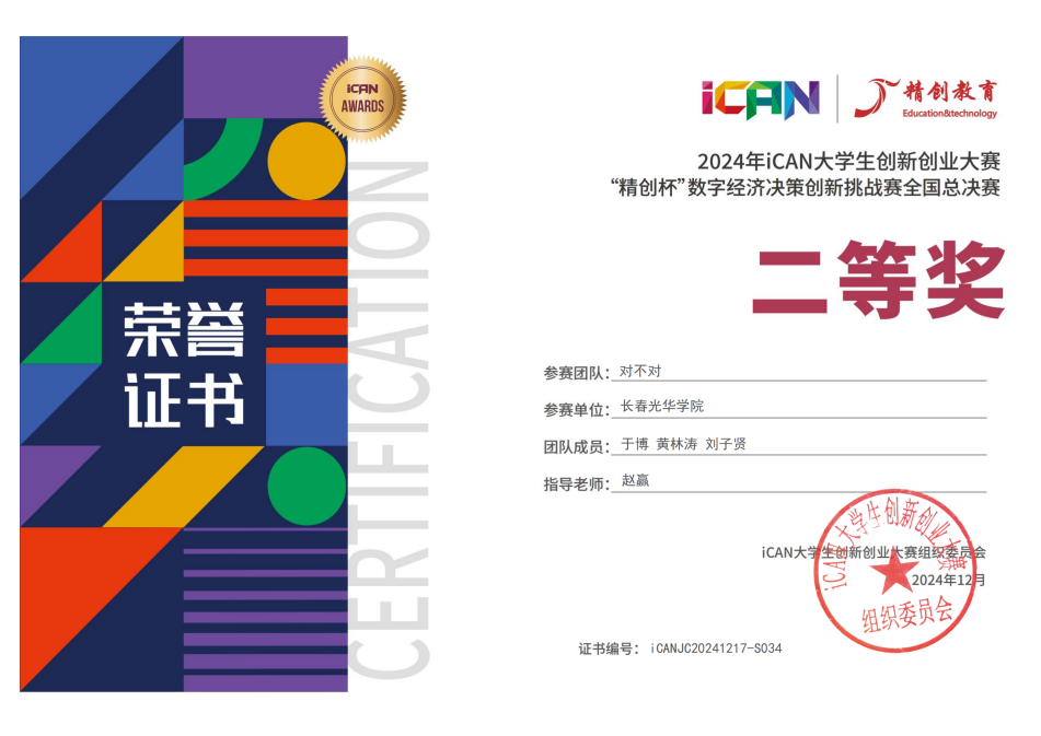 2024年12月7日,由iCAN大学生创新创业大赛组织委员会主办,天津师范大学承办,浙江精创教育科技有限公司提供技术支持的2024年iCAN大学生创新创业大赛“精创杯”数字经济决策创新挑战赛全国总决赛,经过两天的激烈比拼落下帷幕。我校yl6809永利代表队从近500支队伍中脱颖而出,荣获国家二等奖。