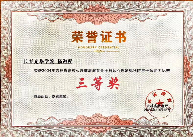 在吉林省高校心理健康教育骨干教师心理危机预防与干预能力比赛中,我校心理中心杨迦程老师获三等奖。