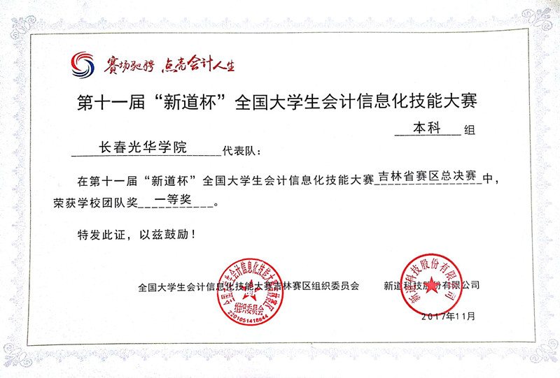 第十一届“新道杯”全国大学生会计信息化技能大赛省赛一等奖