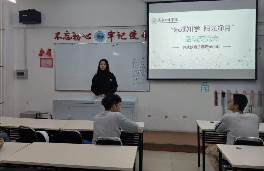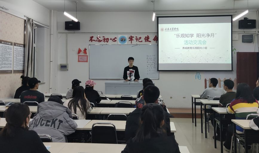 为了进一步推进我校大学生心理健康活动的深入开展,营造有利于学生身心健康发展的校园环境,同时也为了让各位同学了解此次活动的全部内容,养成教育乐观阳光队长胡吕豪于2019年11月6日晚上18:00在三教503教室开展了“乐观知学,阳光净月”的活动交流会。