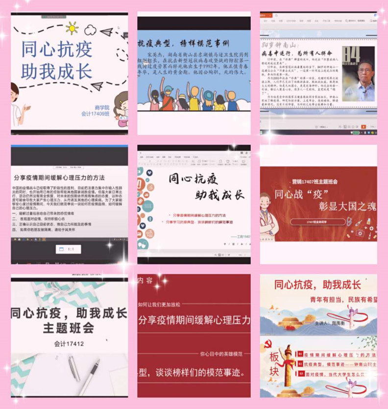 本次主题班会,各班通过PPT解说、视频观看、发言交流等形式开展,内容涵盖疫情期间大学生常见心理问题、宅在家里的心理调节方法、身边战“疫”榜样故事分享、与父母如何进行良好沟通等多个方面,引发了班级内学生的热烈讨论。